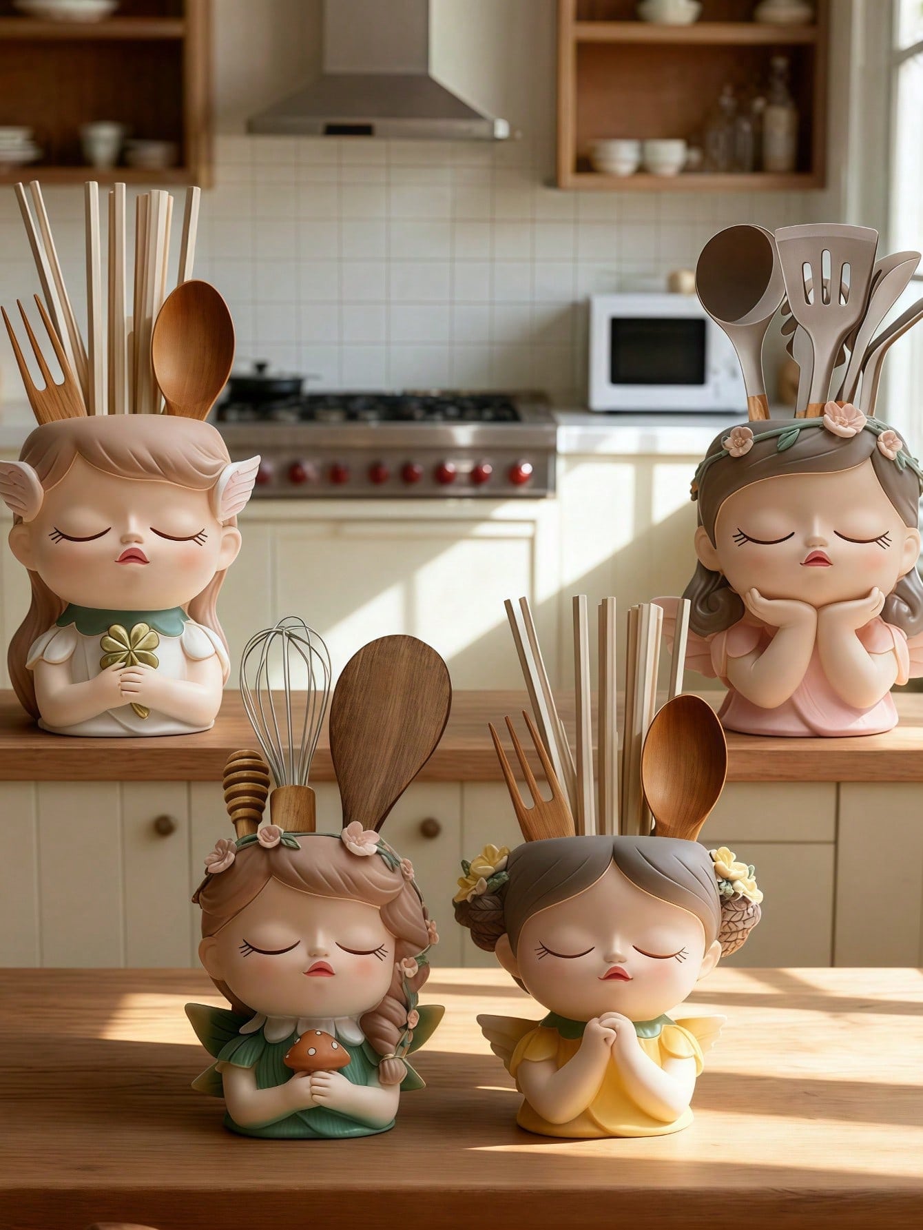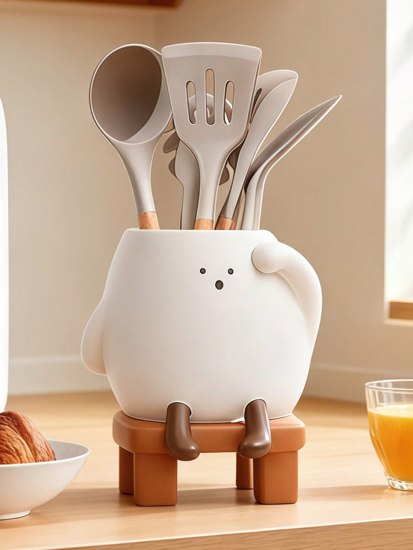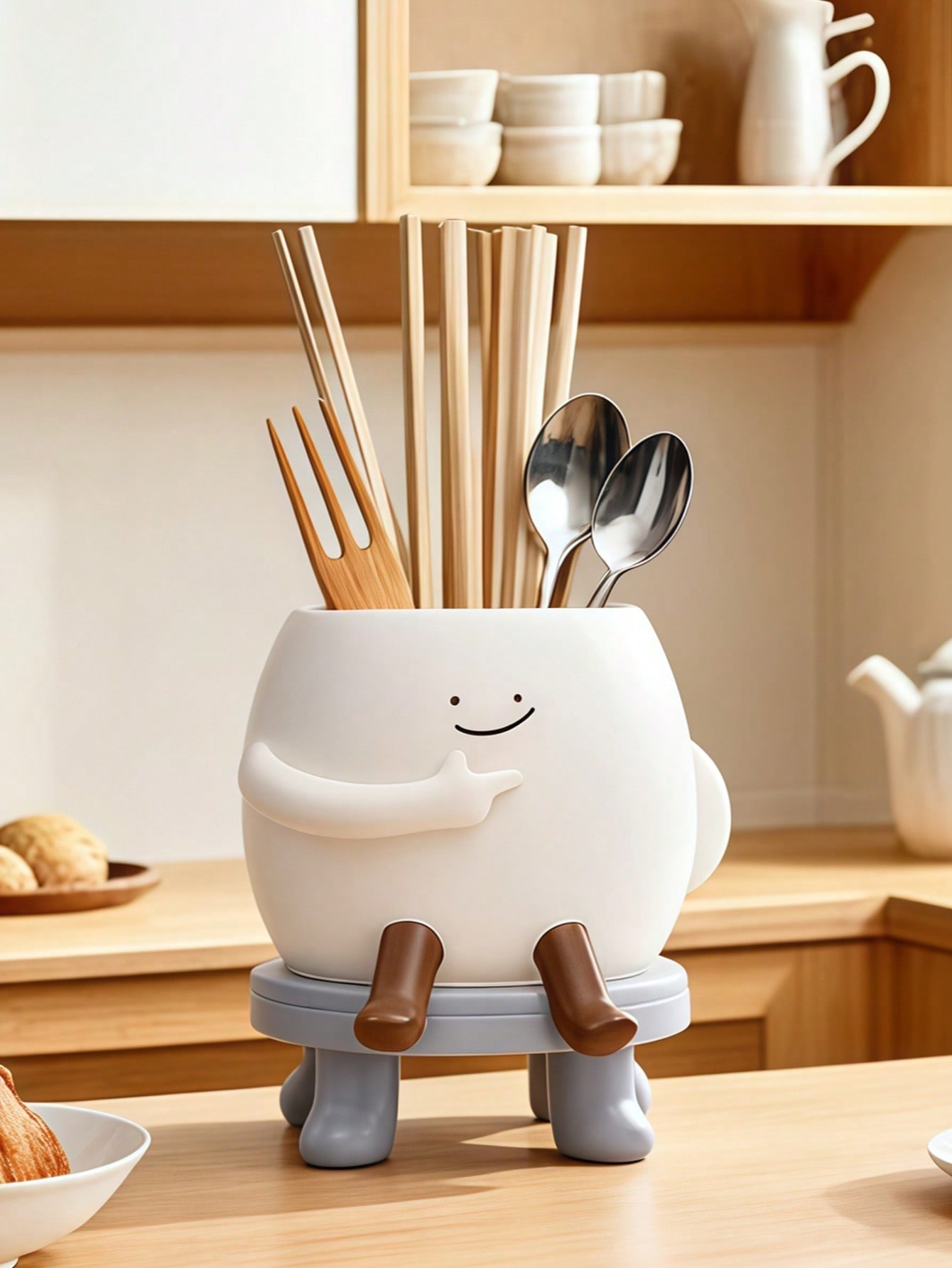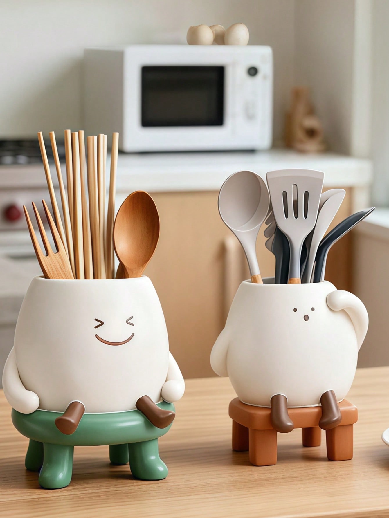 حامل أدوات المطبخ ذو شخصية كرتونية جميلة، منظم أدوات المائدة الخشبية متعدد الوظائف مع تصميم للتصريف،