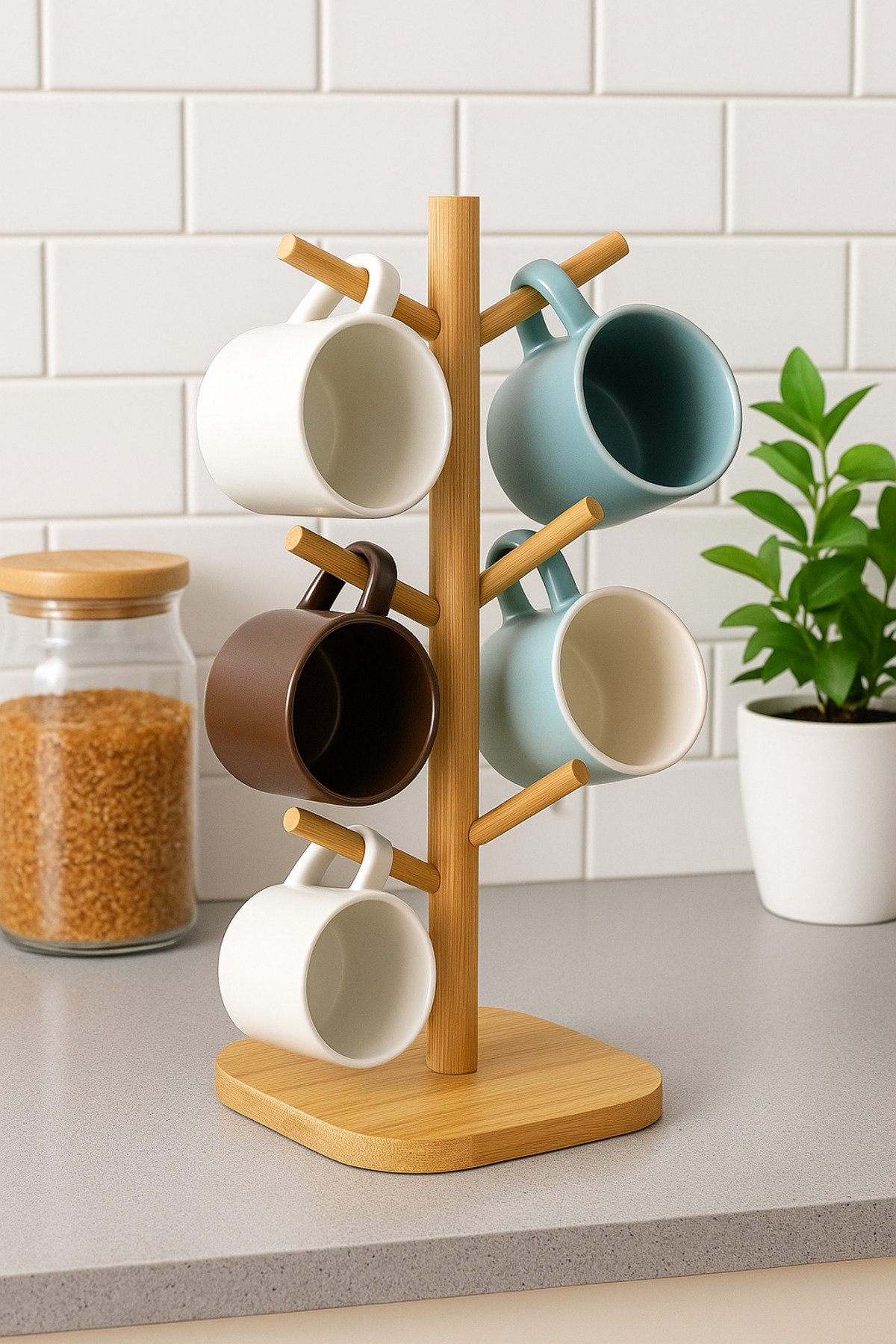 حامل أكواب من الخيزران بـ 6 علاقات - منظم لسطح المطبخ ومجفف للأكواب