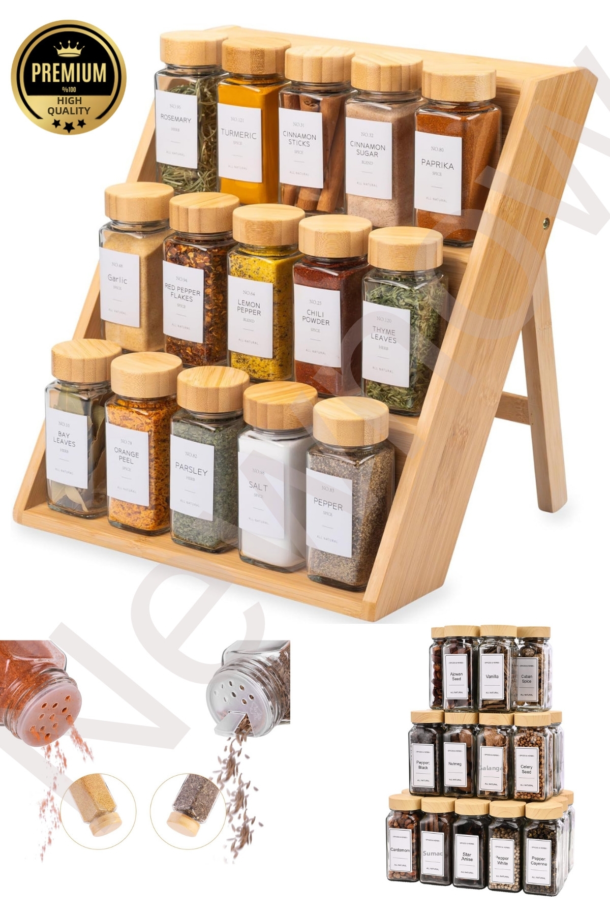 وعاء توابل 15 قطعة مع حامل توابل قائم، وعاء توابل برأس موزع، ملصق 120 مل